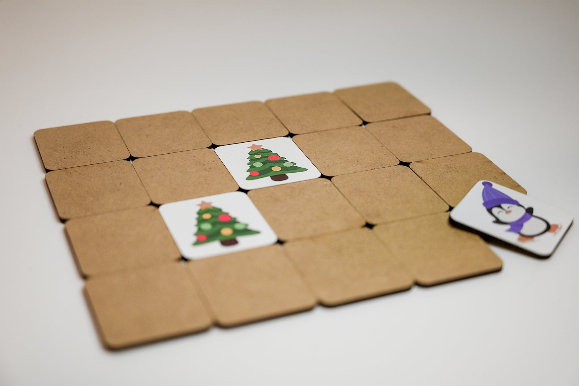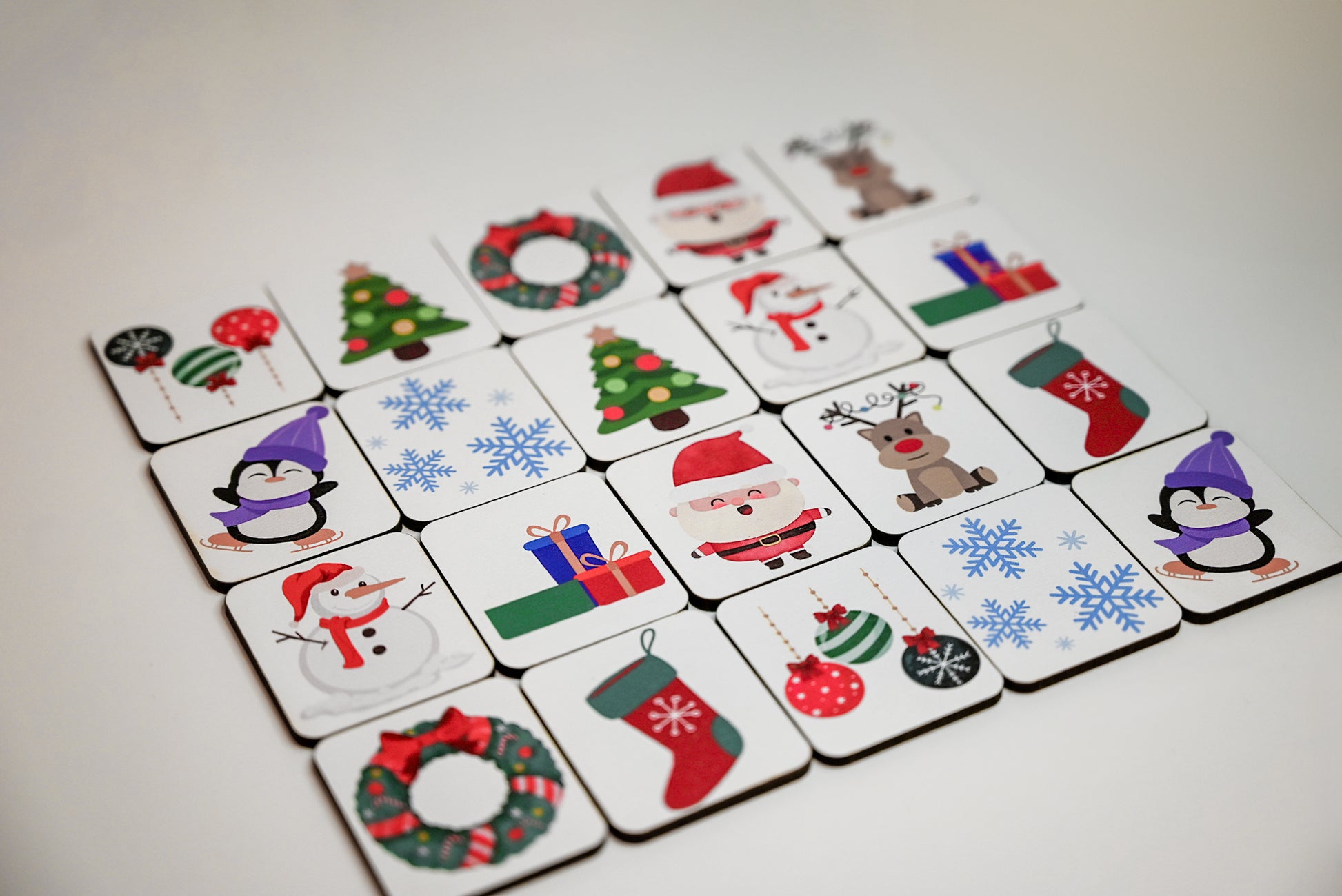 Kalėdinis atminties žaidimas – tai įtraukianti veikla visai šeimai per šventes! Žaidime yra kortelės su įvairiais kalėdiniais motyvais: pingvinais, vainikais, dovanėlėmis, sniego seniais, elniais ir Kalėdų eglutėmis. Tikslas – rasti poras tarp kortelių, lavinant atmintį ir dėmesio koncentraciją. Tai puikus būdas leisti laiką kartu ir kurti gražias akimirkas.