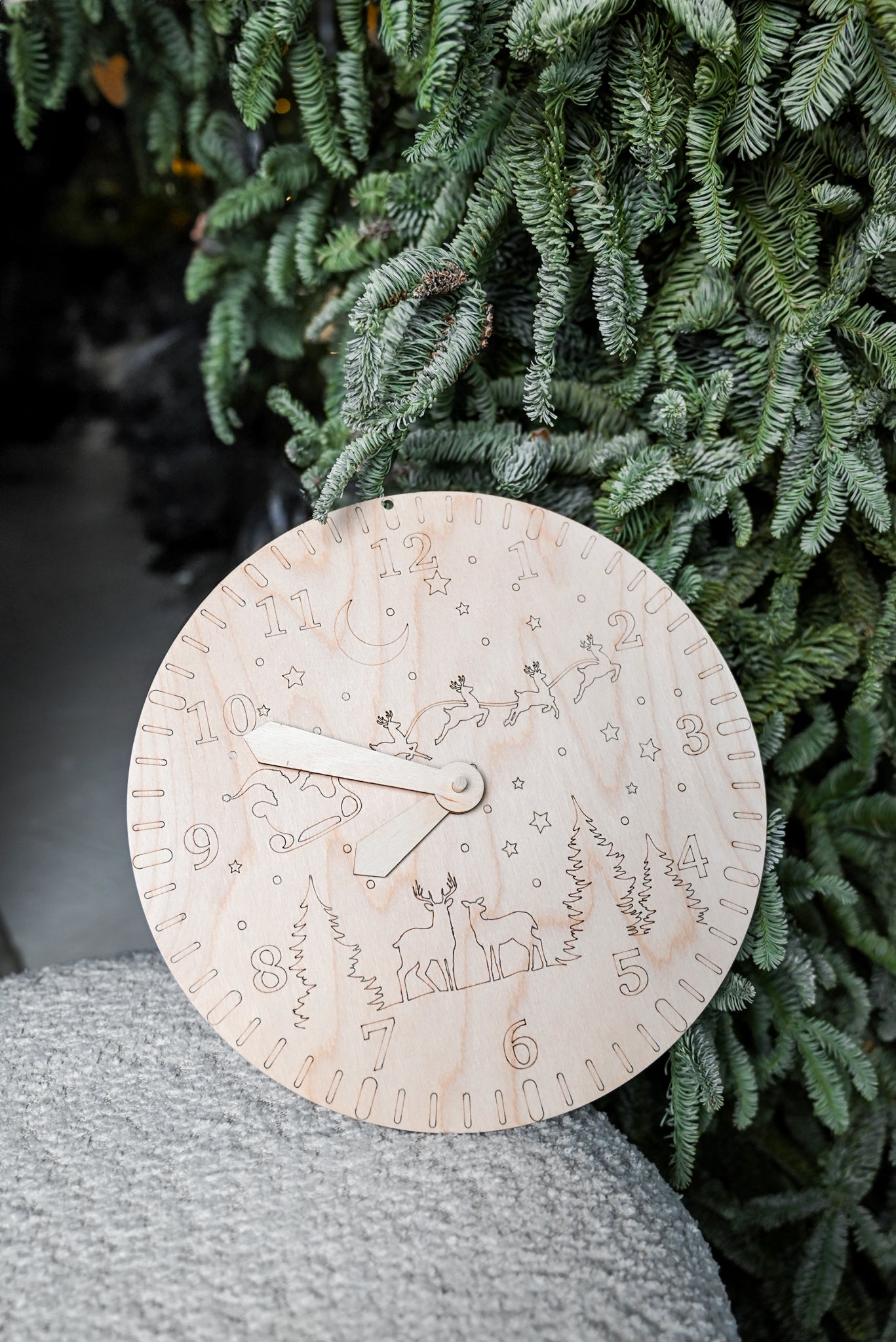 Kalėdinis laikrodis pagamintas iš medienos su subtiliais Kalėdų motyvais, suteikia galimybę spalvinti ir dekoruoti laikrodį pagal savo norus. Puikus užsiėmimas, kuris padeda kurti šventinę nuotaiką ir skatina kūrybiškumą. Nuspalvintas laikrodis taps kalėdiniu aksesuaru namuose, puikiai papildys šventinę aplinką ir primins artėjanti šventinį laikotarpį. Dydis apie 25 cm.