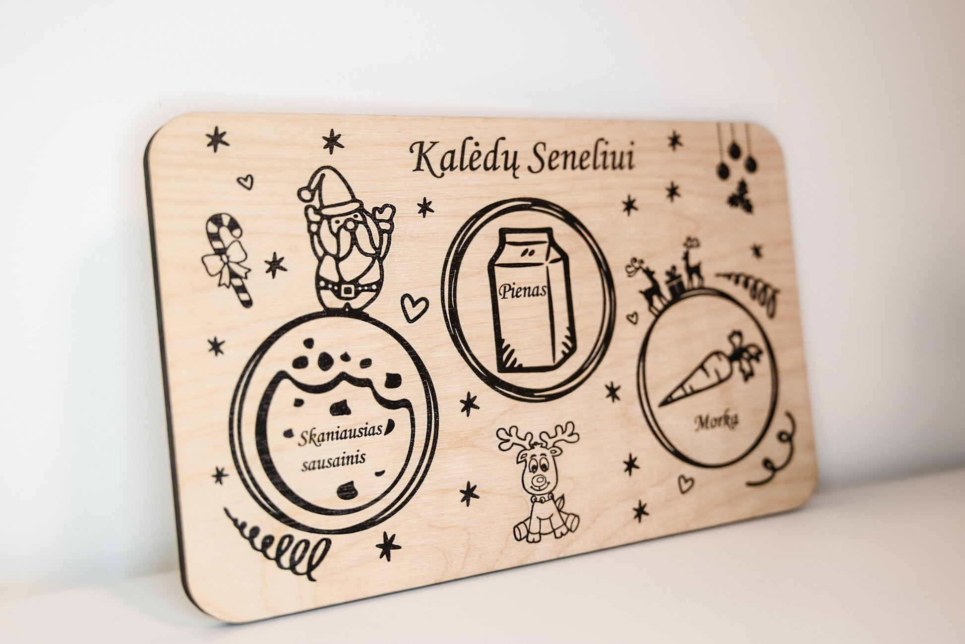 Medinis padėkliukas Kalėdų Seneliui – ypatingas būdas pasiruošti šventinei nakčiai! Padėkliukas turi atskiras vietas sausainiui, pienui ir morkai – viskam, ko prireiks Kalėdų Seneliui ir jo ištikimam elniui per šventinį sustojimą jūsų namuose. Dekoruotas mielais Kalėdų motyvais, padės pasiruošti Kalėdų Senelio apsilankymui. Dydis apie 14x23cm.